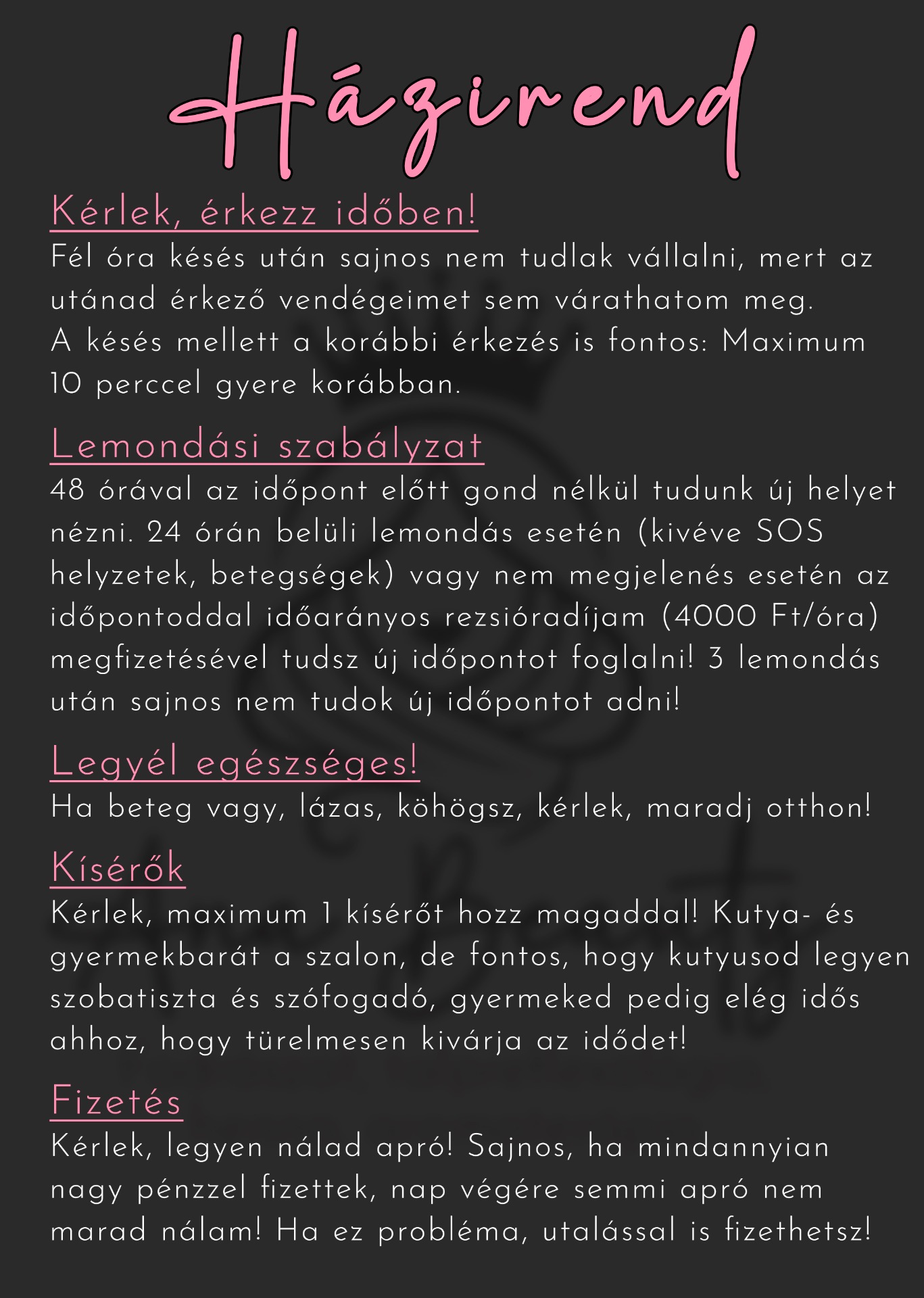 Kérlek, házirendemet tüzetesen olvasd át, mielőtt időpontot kérsz bármilyen szolgáltatásra!